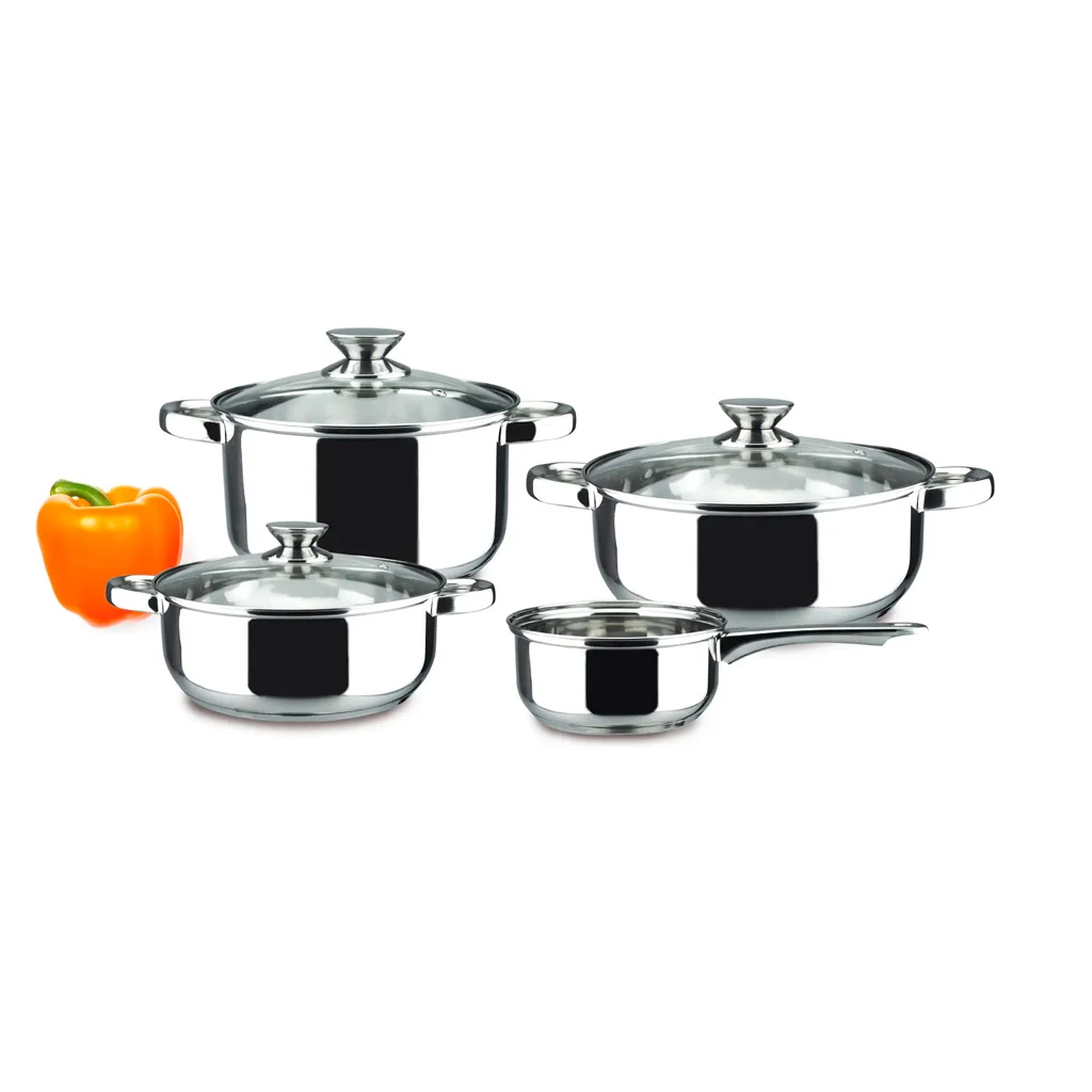 Baterías de cocina de Acero Inoxidable con cuerpos rectos de acabado exterior pulido. Tapas encajables, de vidrio templado, con perfil de acero inoxidable y válvula desvaporizadora, que permite controlar la cocción sin destapar la pieza. Pomo de acero inoxidable.