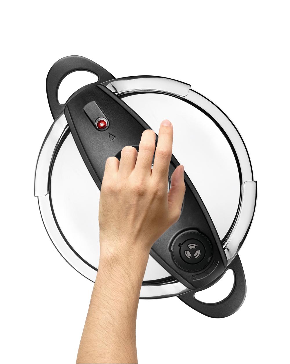 Fantástico sistema de apertura de mínimo esfuerzo, diseñado para abrir y cerrar su olla con solo medio giro y una sola mano.
