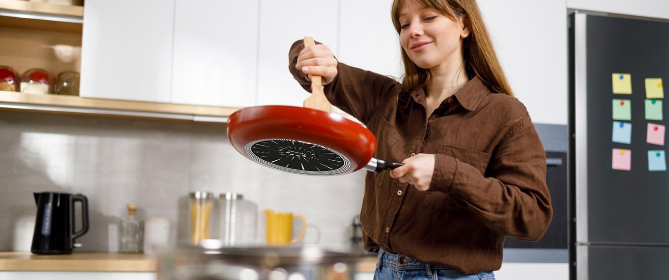 Sartén antiadherente de Acero Vitrificado, con doble capa de esmalte exterior, en vivo color rojo.