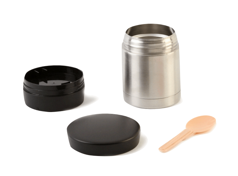 Diseño especialmente indicado para la comida de los niños, que además incluye compartimento con cuchara plegable.